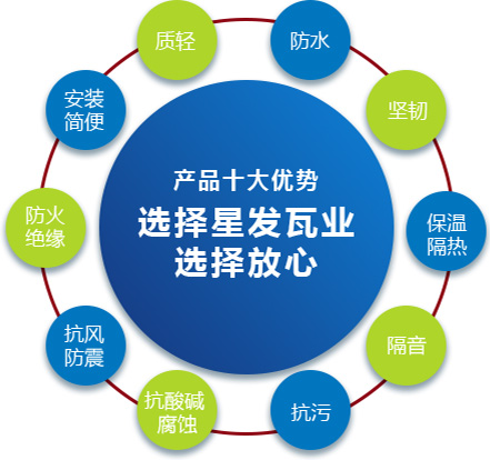 公司主要產(chǎn)品有《星發(fā)牌》合成樹脂瓦、APVC防腐耐候復合瓦、APVC發(fā)泡隔熱瓦、PVC半透明瓦、PVC防腐隔熱瓦、PVC防腐瓦、PVC防腐平板、PVC條紋板和ASA/PVC超耐候復合瓦等產(chǎn)品。產(chǎn)品一經(jīng)推出,已被廣泛應用于國內(nèi)各類平改坡項目和大型工業(yè)項目,遠銷歐洲、亞洲、美洲和非洲等國外市場,還獲選為廣州亞運會、深圳大運會、四川災后重建等工程項目的應用產(chǎn)品。公司在不斷創(chuàng)新和改革的基礎(chǔ)上,力求以更好的產(chǎn)品、優(yōu)良的服務,用心、專心服務好每一個客戶。